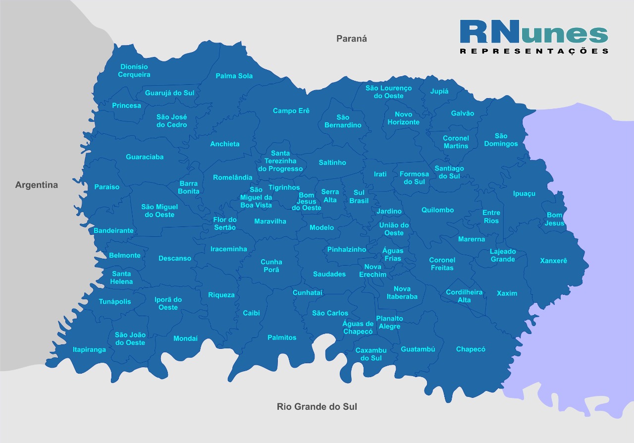 A RNunes Representações possui abrangência em todo o extremo oeste de Santa Catarina, conforme mapa.